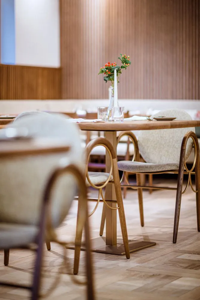 Joachim Riml vom Architekturbüro atelier3 setzt bei der Planung für den Umbau des Dorfhotel Mayer in St. Martin auf Akustikboard von Designfront. Der passende Farbton zur Bestuhlung wurde speziell für dieses Projekt von Designfront entwickelt und von Hand aufgebracht. Durch den mehrschichtigen Aufbau der Oberfläche kommt einerseits die natürliche Maserung der Eiche besonders zur Geltung, andererseits wird dadurch gleichzeitig die Oberfläche geschützt und pflegeleicht.