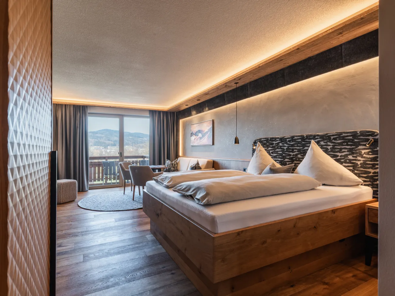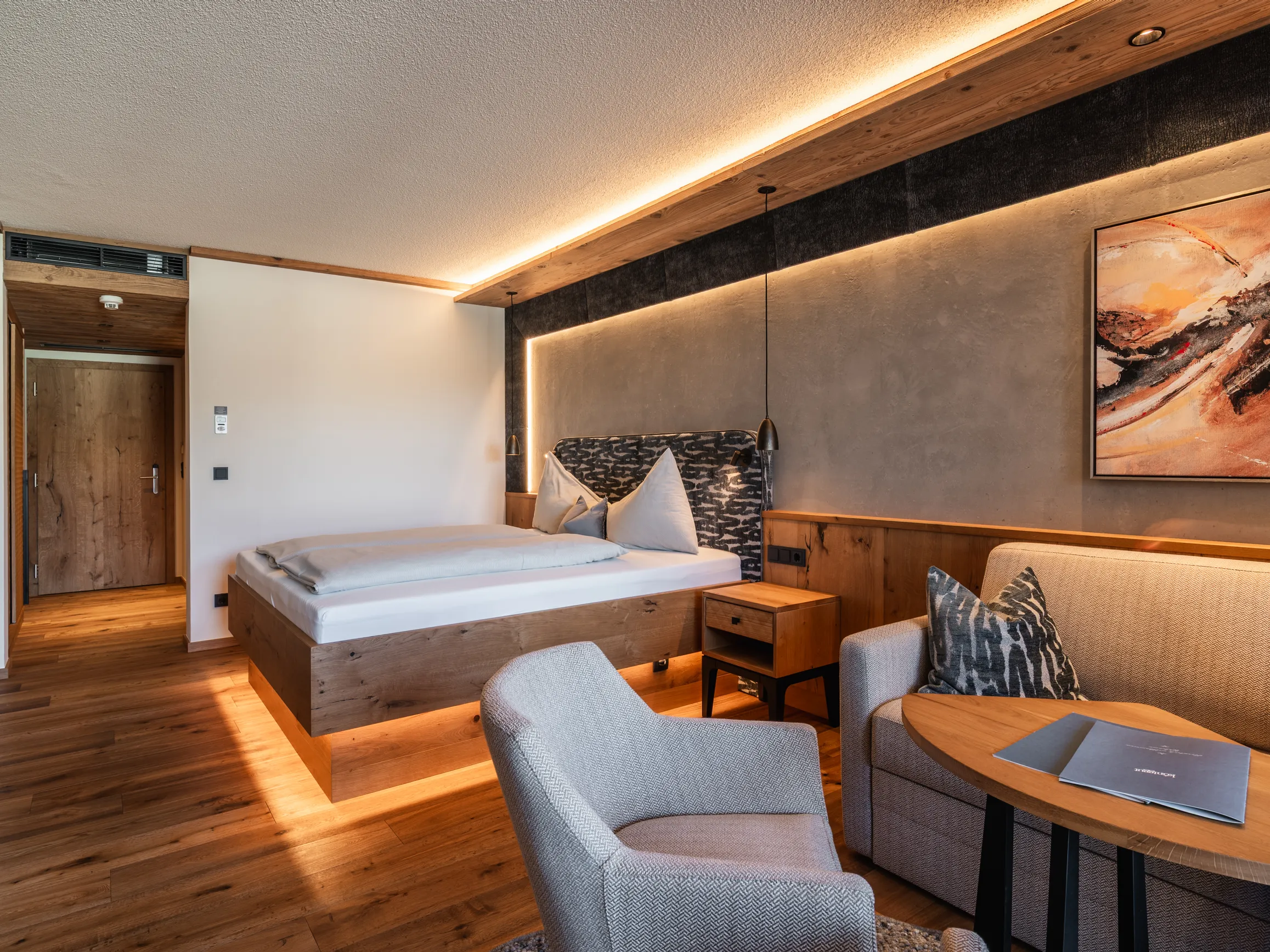 modernes hotelzimmer mit holzmobeln doppelbett und gemutlicher sitzecke